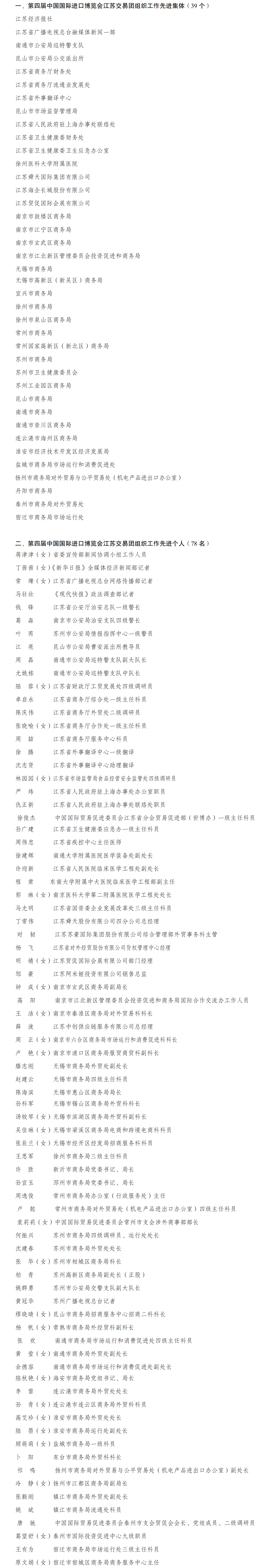关于开展第四届中国国际进口博览会江苏交易团组织工作先进集体先进个人评选表彰活动的通知》(苏商运〔2022〕307号),部署开展了评选表彰工作。经省交易团相关成员单位及各交易分团归口推荐,江苏交易团组织工作先进集体先进个人评选工作领导小组严格审核,39个先进集体和78名先进个人的名单已确定,现将名单予以公示。