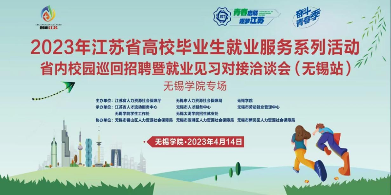 “青春启航·逐梦江苏”2023年江苏省高校毕业生就业服务系列活动省内校园巡回招聘暨就业见习对接洽谈会(无锡站)—无锡学院专场,将于4月14日(周五)下午14:30-17:00在无锡学院体育馆二楼举办。