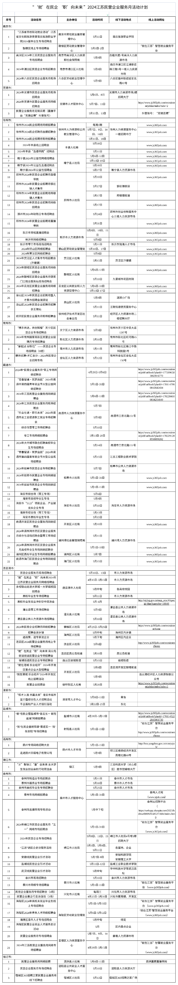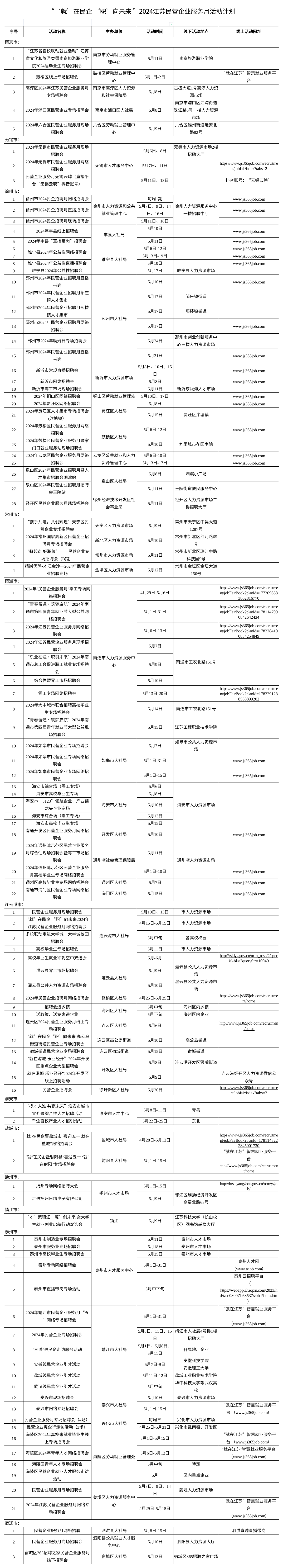三级联动促成效。将服务月活动与“百校千企万岗”大学生就业帮扶行动、“百城千校万企”促就业行动相结合,统筹职能部门资源,形成合力,省市县(区)联动举办各类专场招聘、校园招聘、直播带岗等供需对接活动。徐州市分期分批开展现场、网络、直播等活动,持续更新民营企业岗位需求。4月下旬,南通市人社部门和总工会联动发力,举办“助企纳才•职等你来”总工会促进职工就业现场系列招聘会。扬州市神舟汽车内饰件公司负责人表示民营企业专场能够吸引很多一线技术人员前来应聘,可以有效缓解民营单位一线招工压力,为企业发展注入新活力。盐城市五一假期开展“就”在民企暨盐城市“喜迎五一 就在盐城”探厂直播招聘活动。